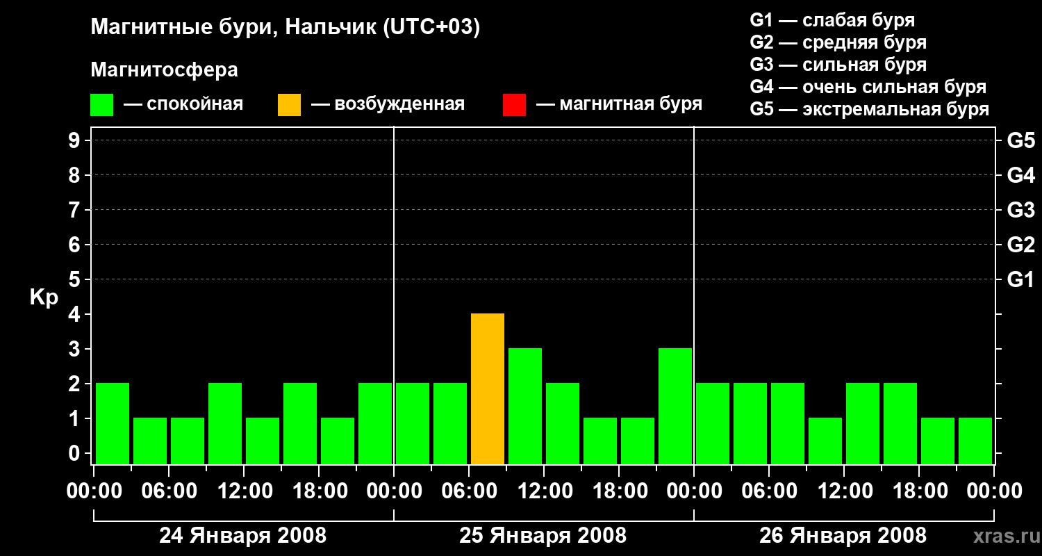 Изменения геомагнитного индекса Kp с 24 по 26 января 2008 года для средних широт