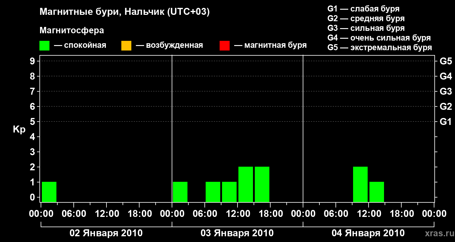 Изменения геомагнитного индекса Kp с 2 по 4 января 2010 года для средних широт