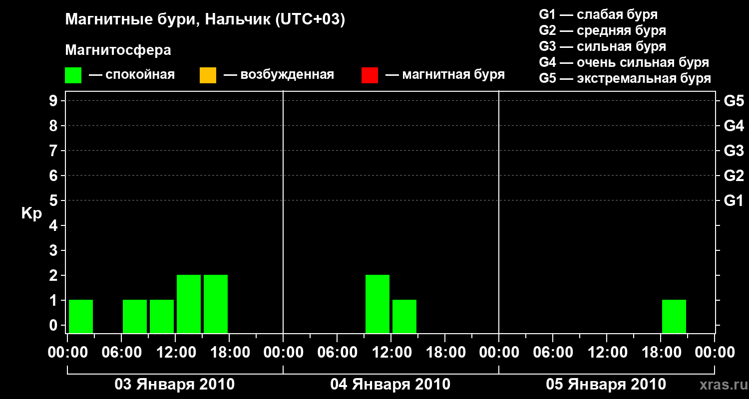 Изменения геомагнитного индекса Kp с 3 по 5 января 2010 года для средних широт