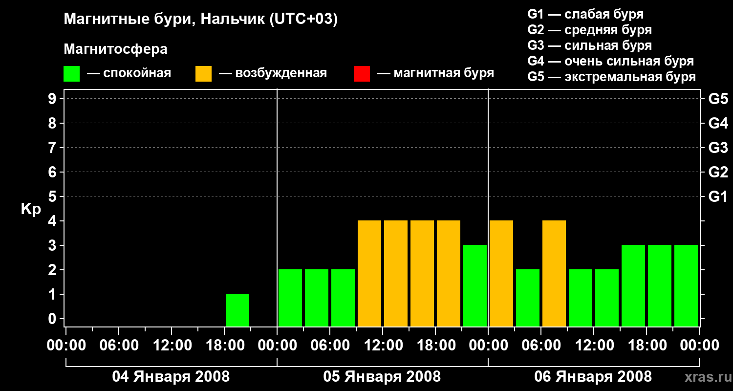 Изменения геомагнитного индекса Kp с 4 по 6 января 2008 года для средних широт