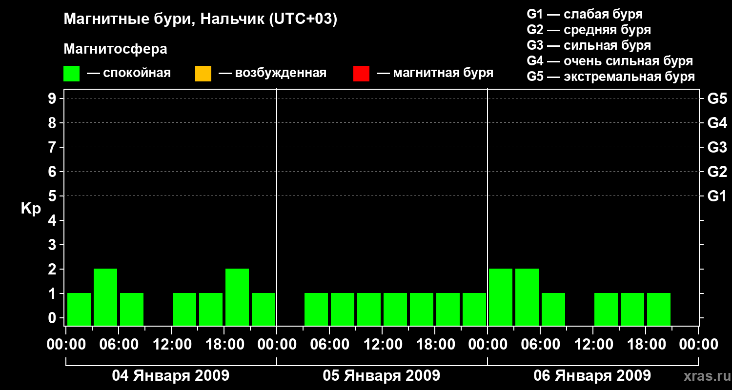 Изменения геомагнитного индекса Kp с 4 по 6 января 2009 года для средних широт
