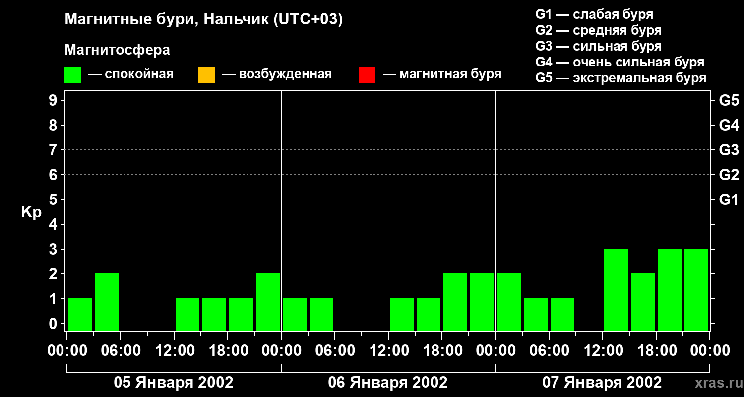 Изменения геомагнитного индекса Kp с 5 по 7 января 2002 года для средних широт