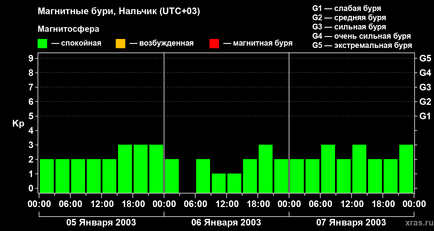Изменения геомагнитного индекса Kp с 5 по 7 января 2003 года для средних широт