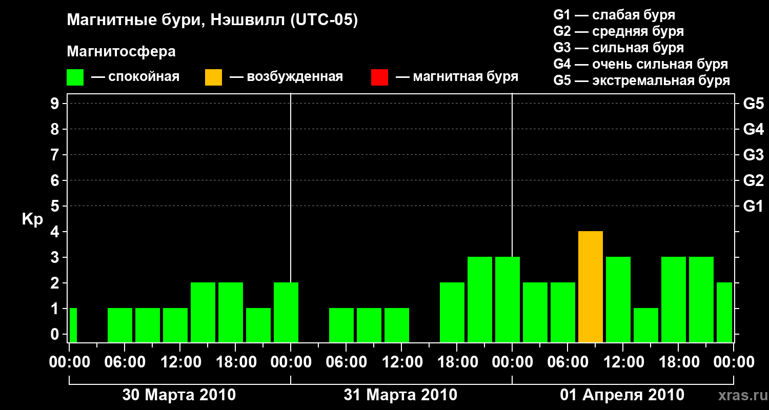 Изменения геомагнитного индекса Kp с 30 марта по 1 апреля 2010 года для средних широт