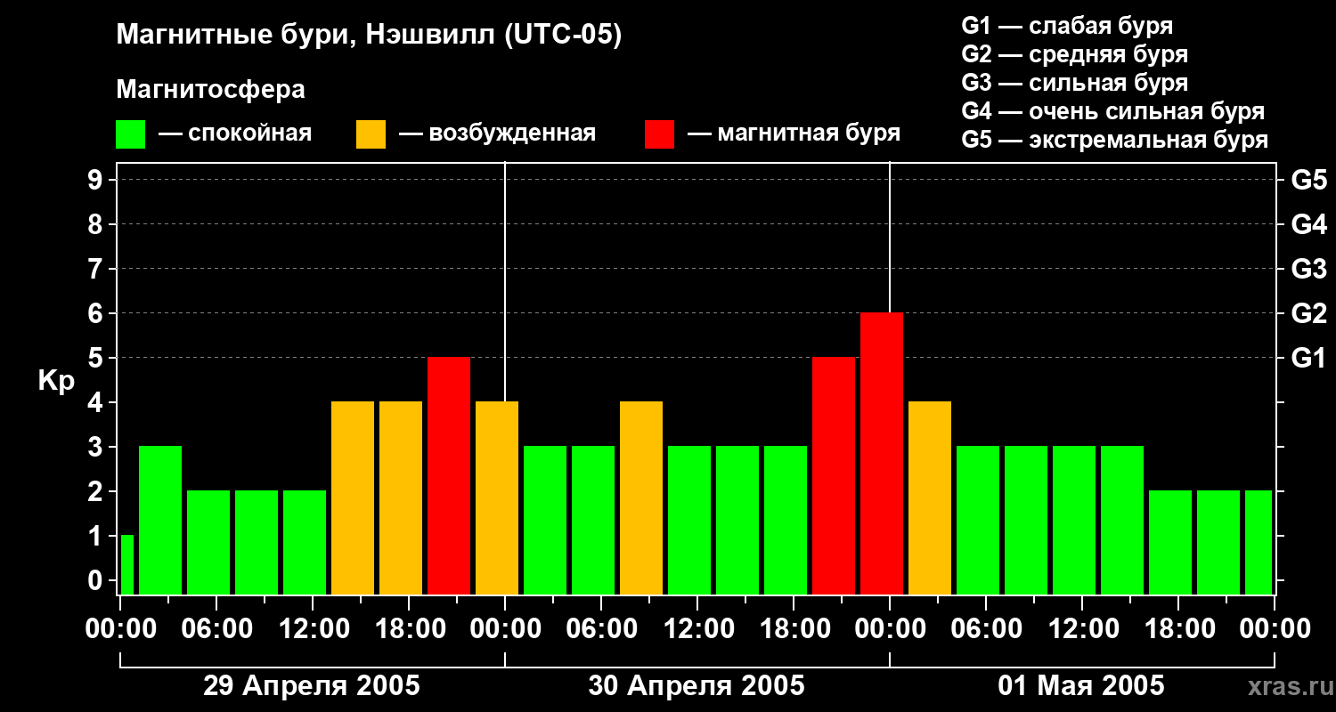 Изменения геомагнитного индекса Kp с 29 апреля по 1 мая 2005 года для средних широт