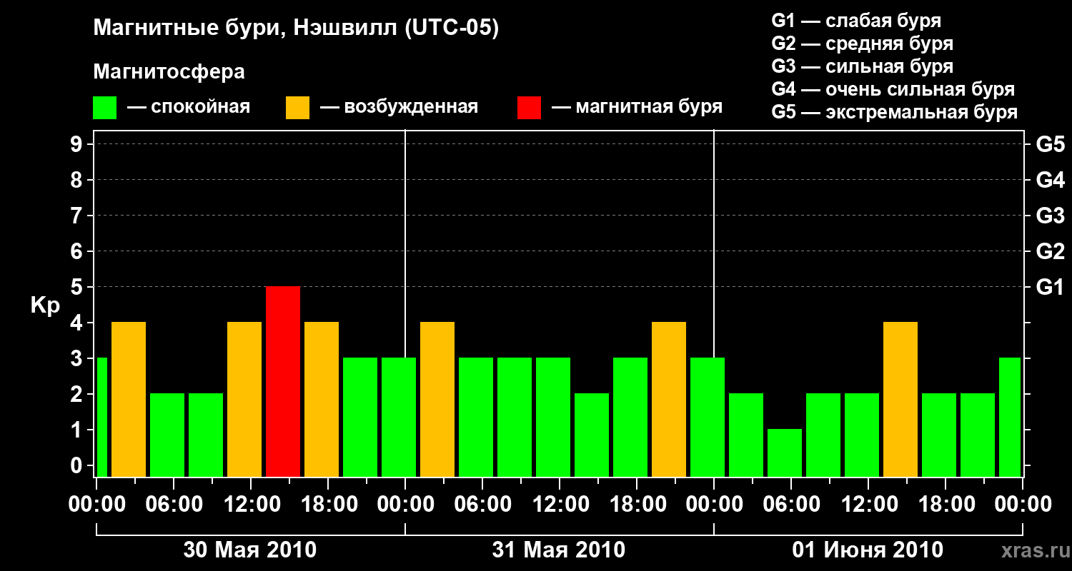 Изменения геомагнитного индекса Kp с 30 мая по 1 июня 2010 года для средних широт