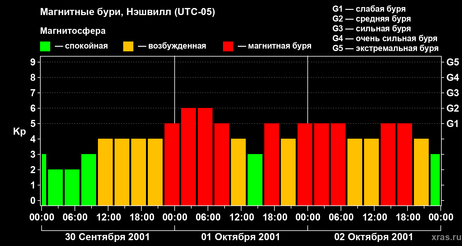 Изменения геомагнитного индекса Kp с 30 сентября по 2 октября 2001 года для средних широт