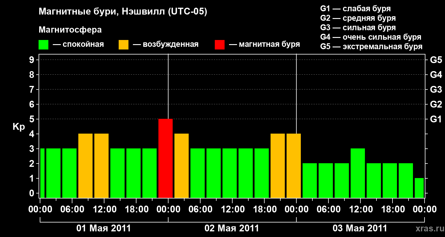 Изменения геомагнитного индекса Kp с 1 по 3 мая 2011 года для средних широт