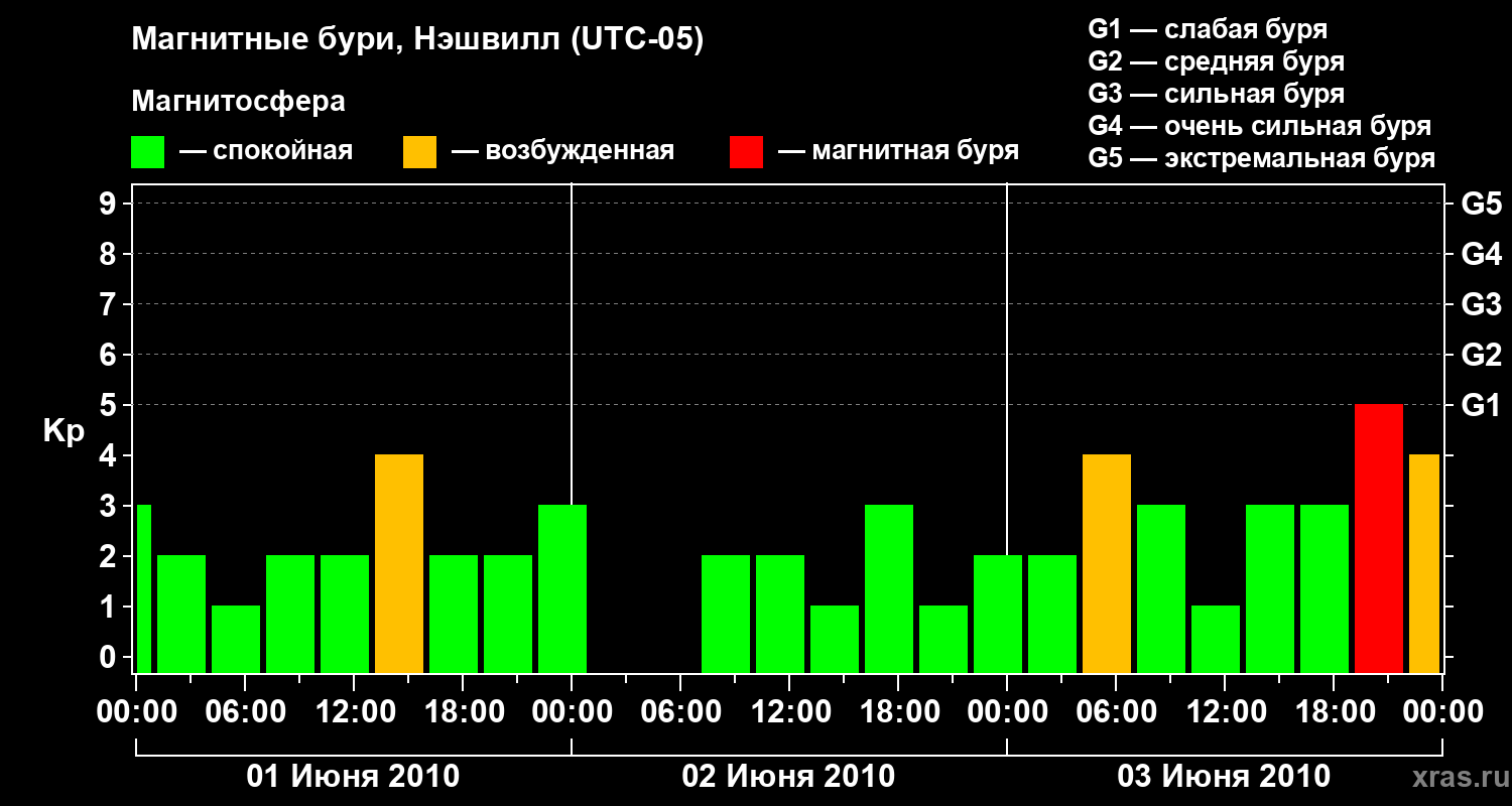 Изменения геомагнитного индекса Kp с 1 по 3 июня 2010 года для средних широт