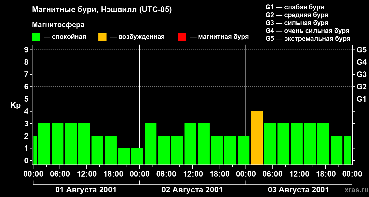 Изменения геомагнитного индекса Kp с 1 по 3 августа 2001 года для средних широт