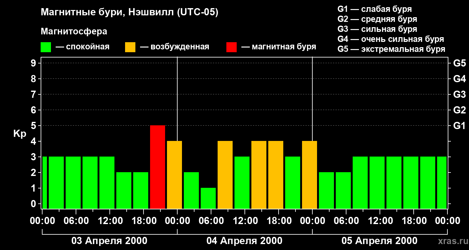 Изменения геомагнитного индекса Kp с 3 по 5 апреля 2000 года для средних широт