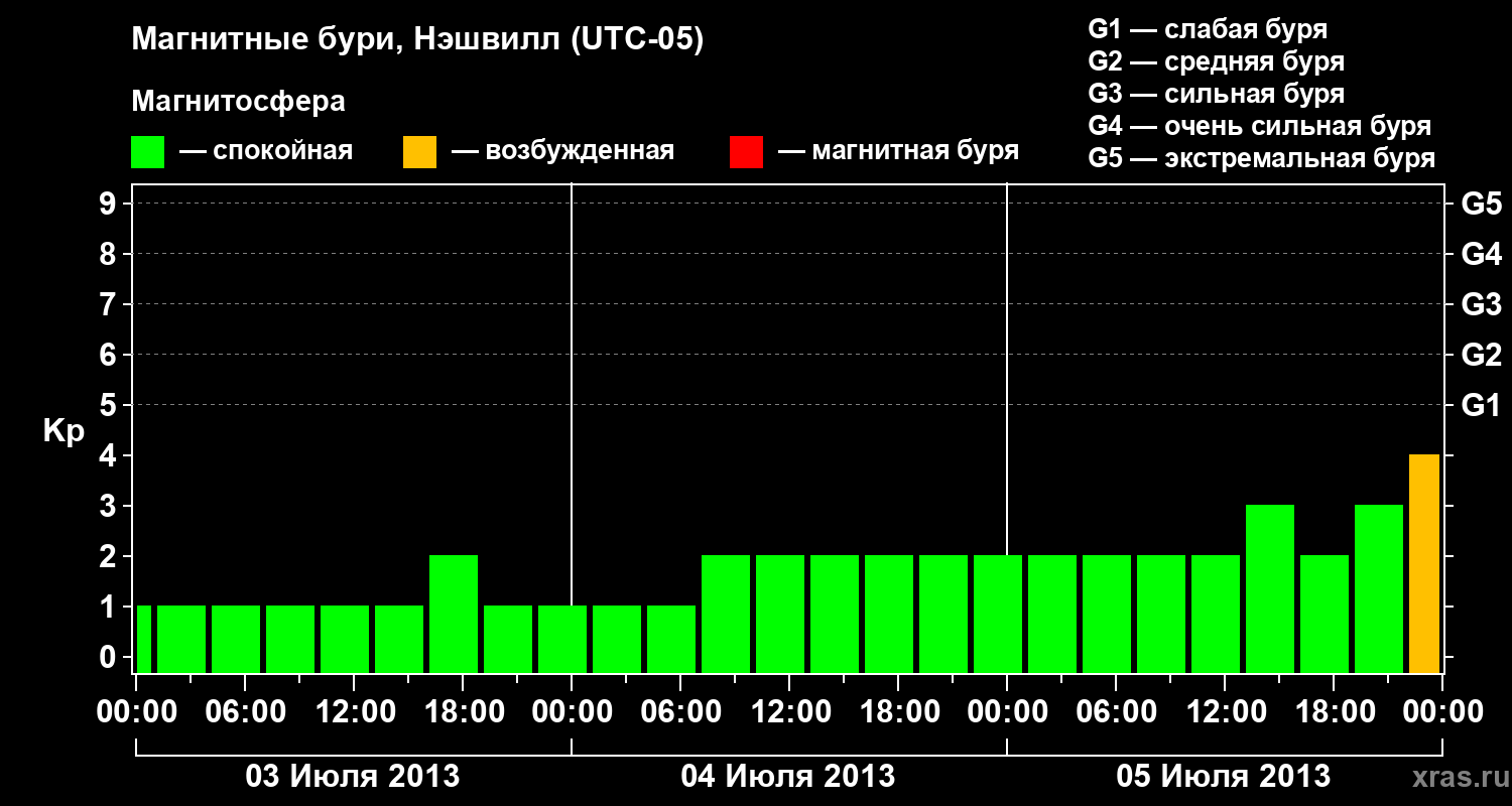 Изменения геомагнитного индекса Kp с 3 по 5 июля 2013 года для средних широт