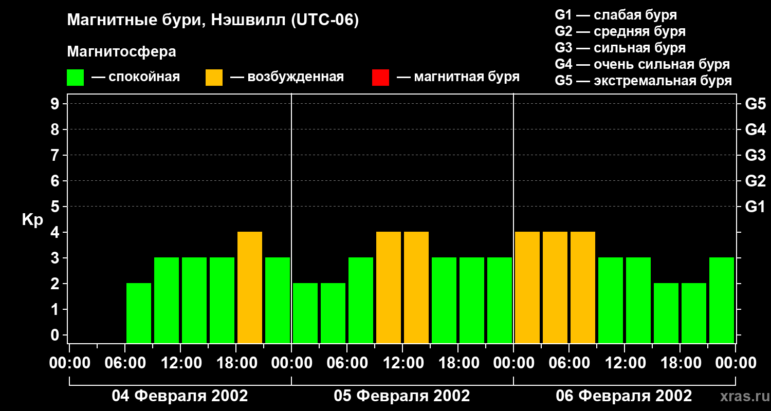 Изменения геомагнитного индекса Kp с 4 по 6 февраля 2002 года для средних широт