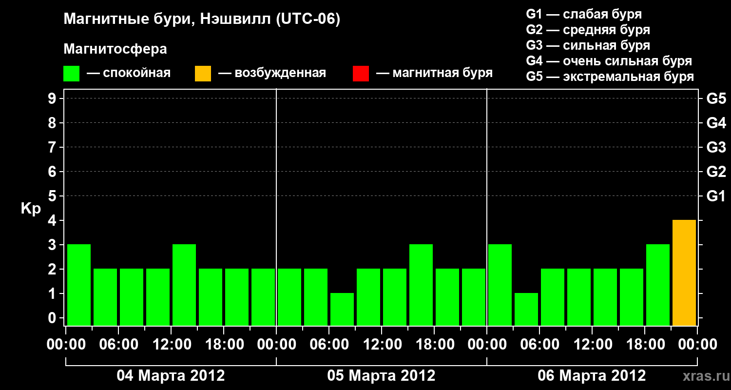 Изменения геомагнитного индекса Kp с 4 по 6 марта 2012 года для средних широт