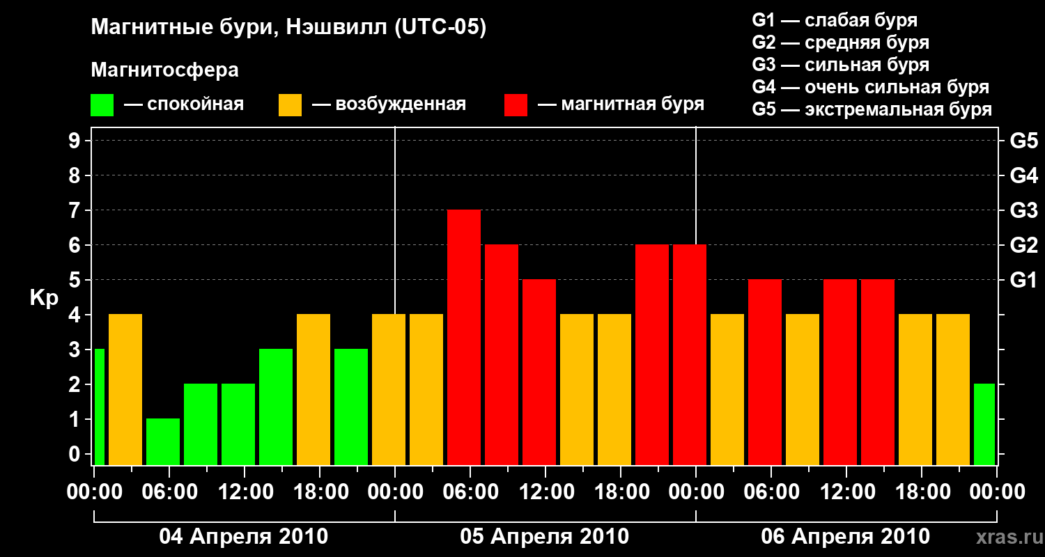 Изменения геомагнитного индекса Kp с 4 по 6 апреля 2010 года для средних широт
