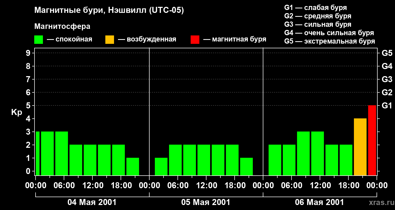Изменения геомагнитного индекса Kp с 4 по 6 мая 2001 года для средних широт