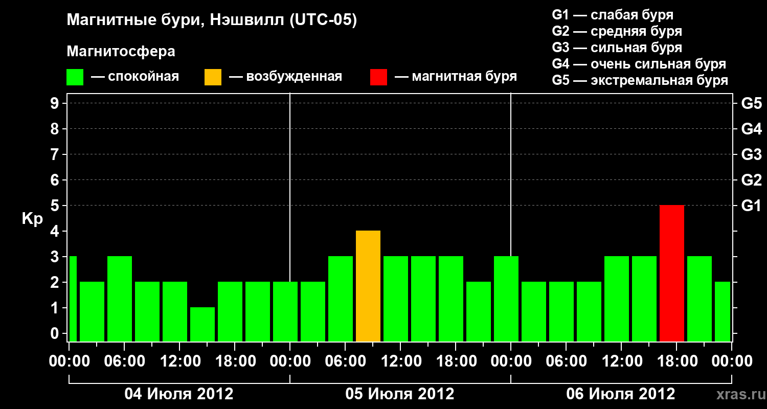 Изменения геомагнитного индекса Kp с 4 по 6 июля 2012 года для средних широт