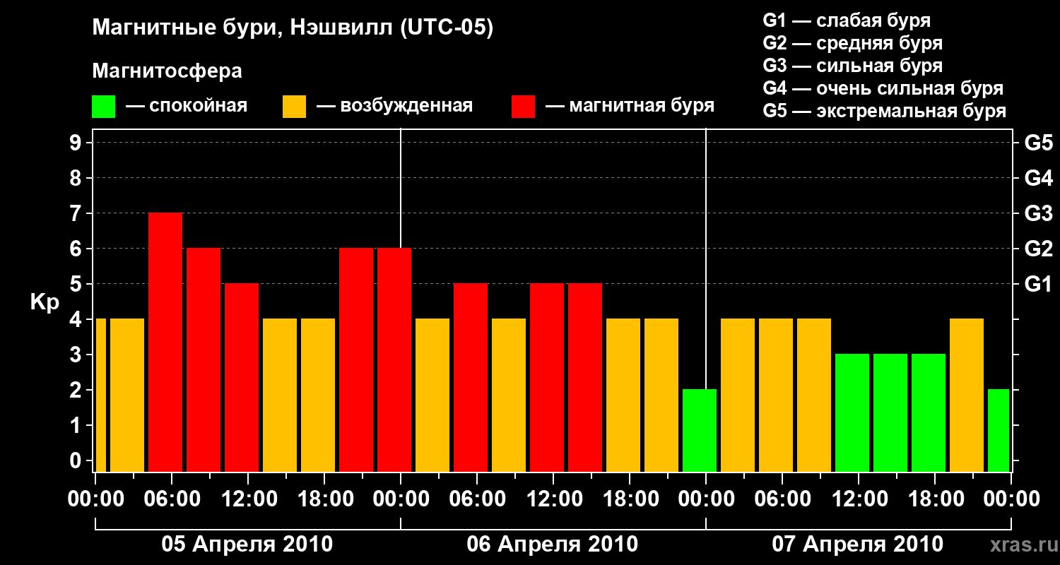 Изменения геомагнитного индекса Kp с 5 по 7 апреля 2010 года для средних широт