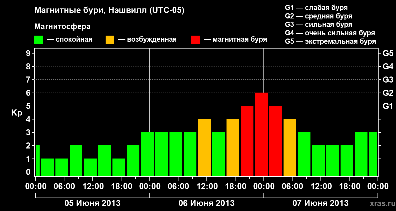 Изменения геомагнитного индекса Kp с 5 по 7 июня 2013 года для средних широт