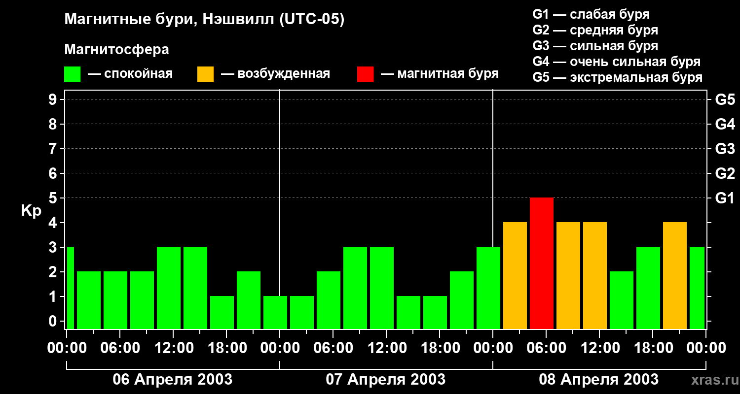 Изменения геомагнитного индекса Kp с 6 по 8 апреля 2003 года для средних широт
