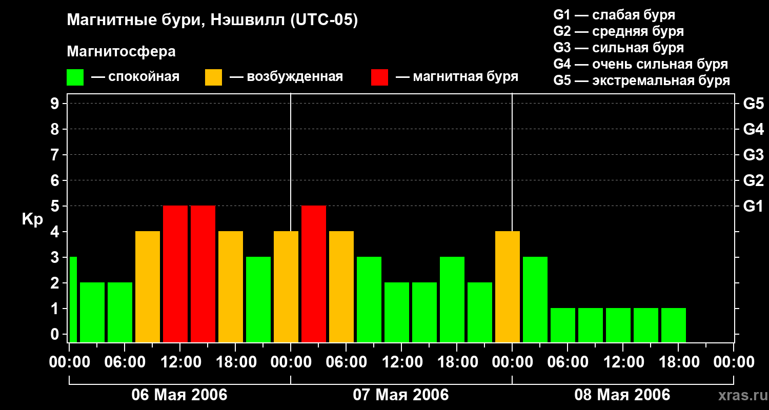Изменения геомагнитного индекса Kp с 6 по 8 мая 2006 года для средних широт