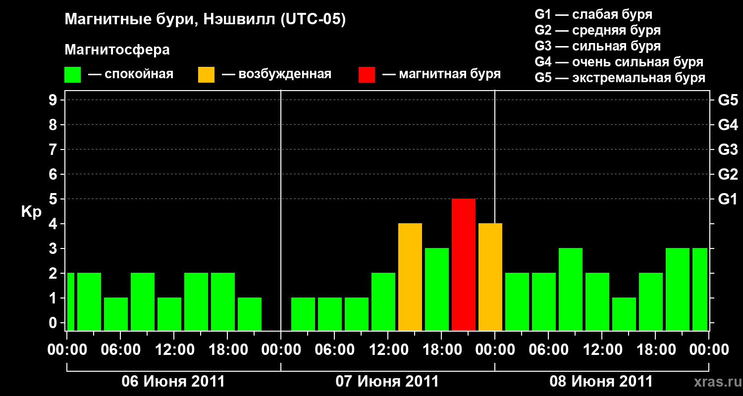 Изменения геомагнитного индекса Kp с 6 по 8 июня 2011 года для средних широт