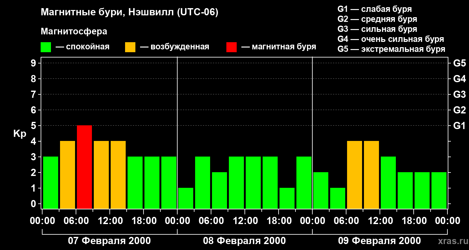 Изменения геомагнитного индекса Kp с 7 по 9 февраля 2000 года для средних широт
