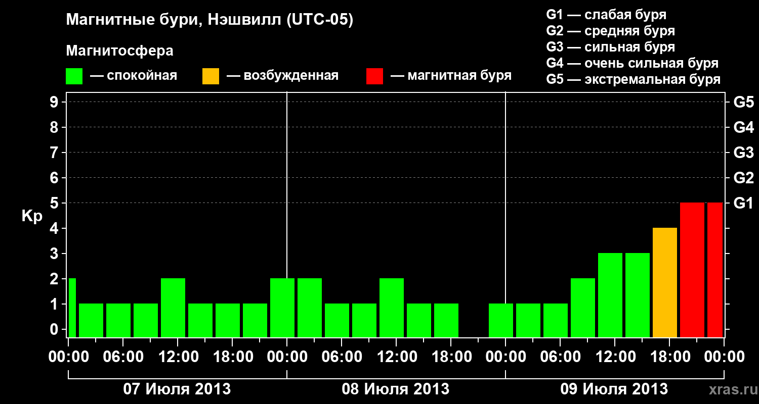 Изменения геомагнитного индекса Kp с 7 по 9 июля 2013 года для средних широт