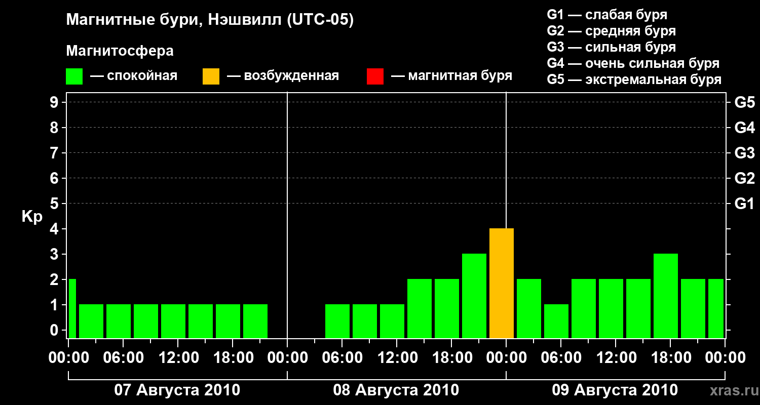 Изменения геомагнитного индекса Kp с 7 по 9 августа 2010 года для средних широт