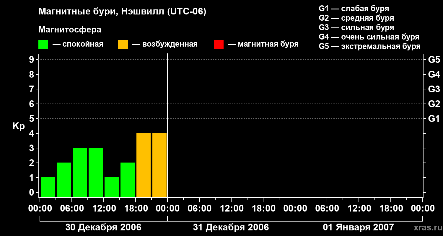 Изменения геомагнитного индекса Kp с 30 декабря 2006 года по 1 января 2007 года для средних широт