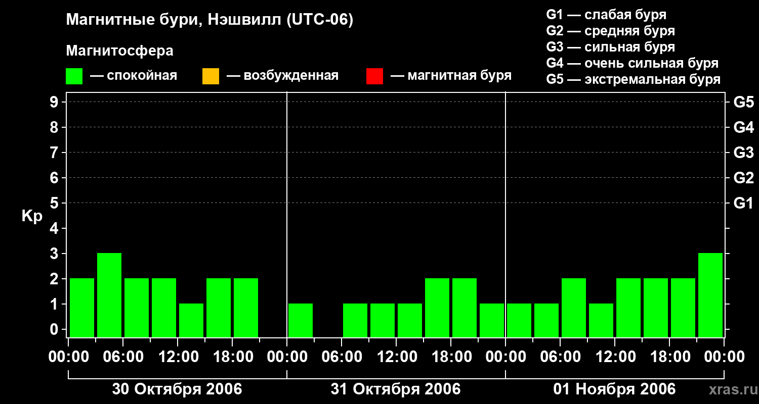 Изменения геомагнитного индекса Kp с 30 октября по 1 ноября 2006 года для средних широт