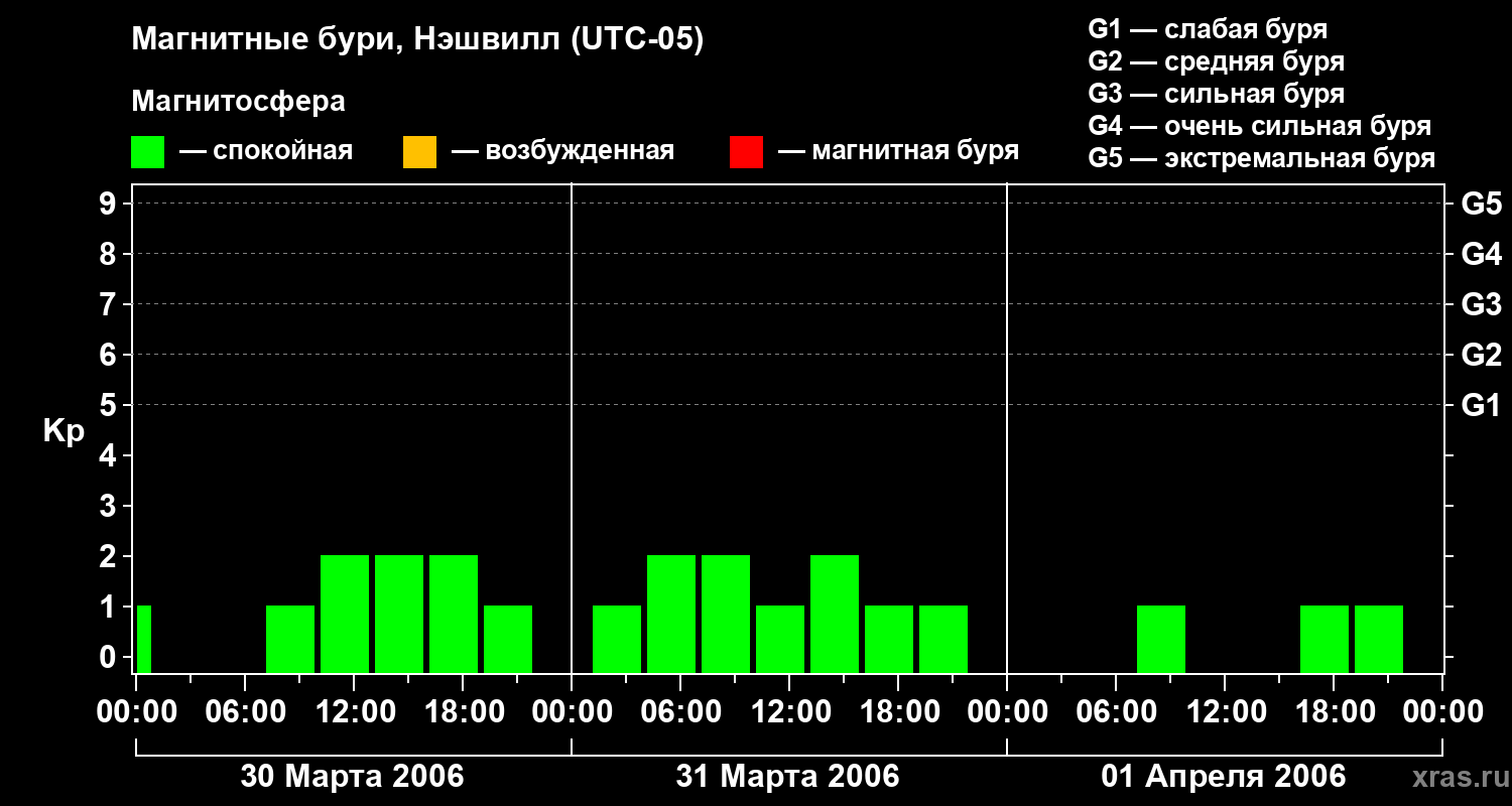 Изменения геомагнитного индекса Kp с 30 марта по 1 апреля 2006 года для средних широт