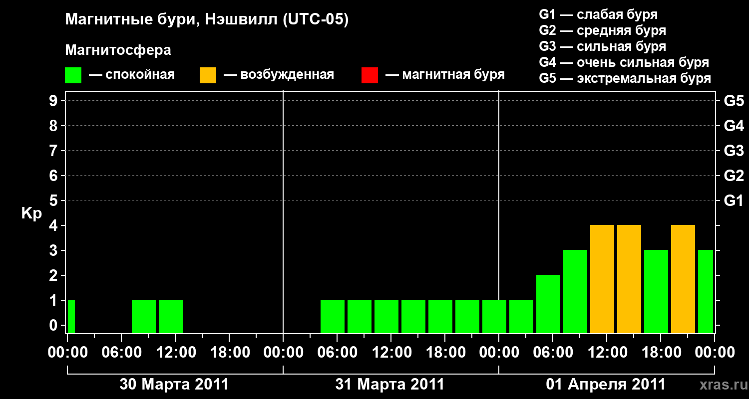 Изменения геомагнитного индекса Kp с 30 марта по 1 апреля 2011 года для средних широт