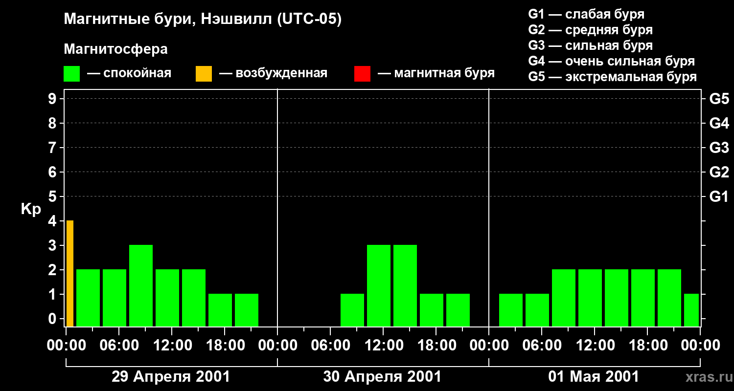 Изменения геомагнитного индекса Kp с 29 апреля по 1 мая 2001 года для средних широт