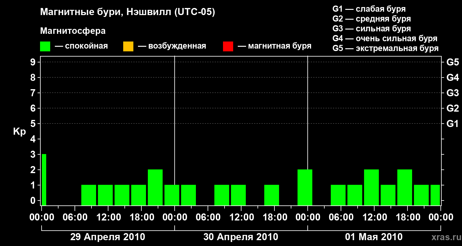 Изменения геомагнитного индекса Kp с 29 апреля по 1 мая 2010 года для средних широт