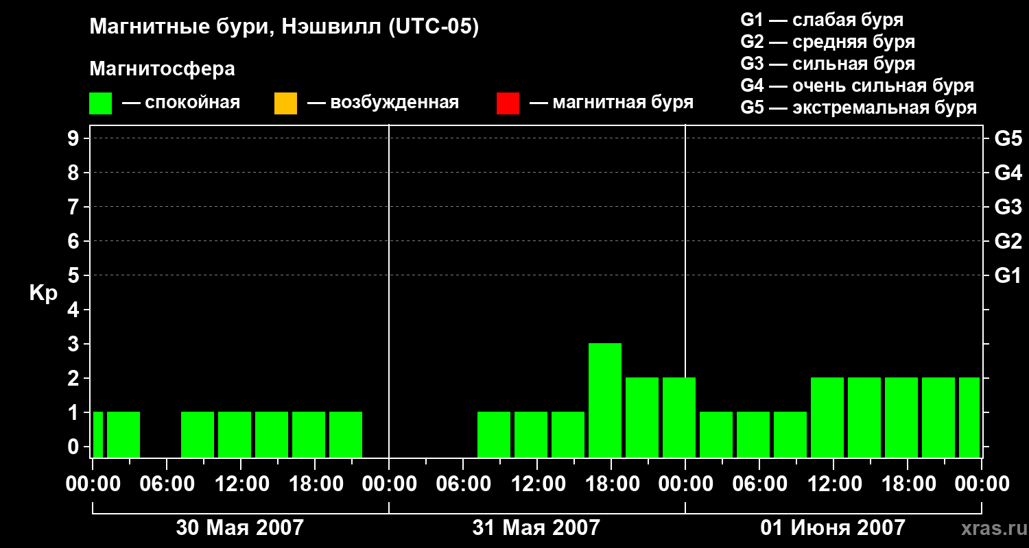 Изменения геомагнитного индекса Kp с 30 мая по 1 июня 2007 года для средних широт