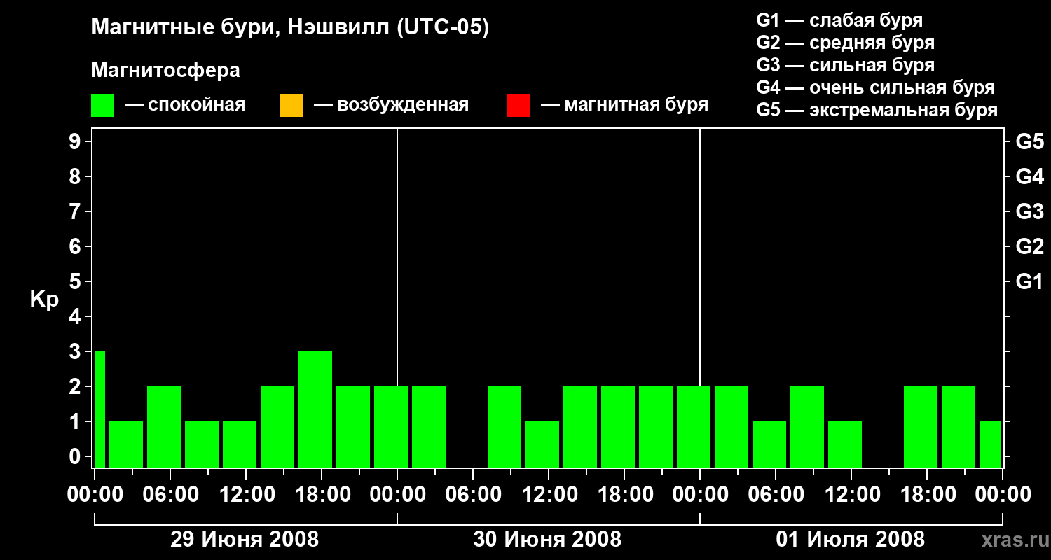 Изменения геомагнитного индекса Kp с 29 июня по 1 июля 2008 года для средних широт