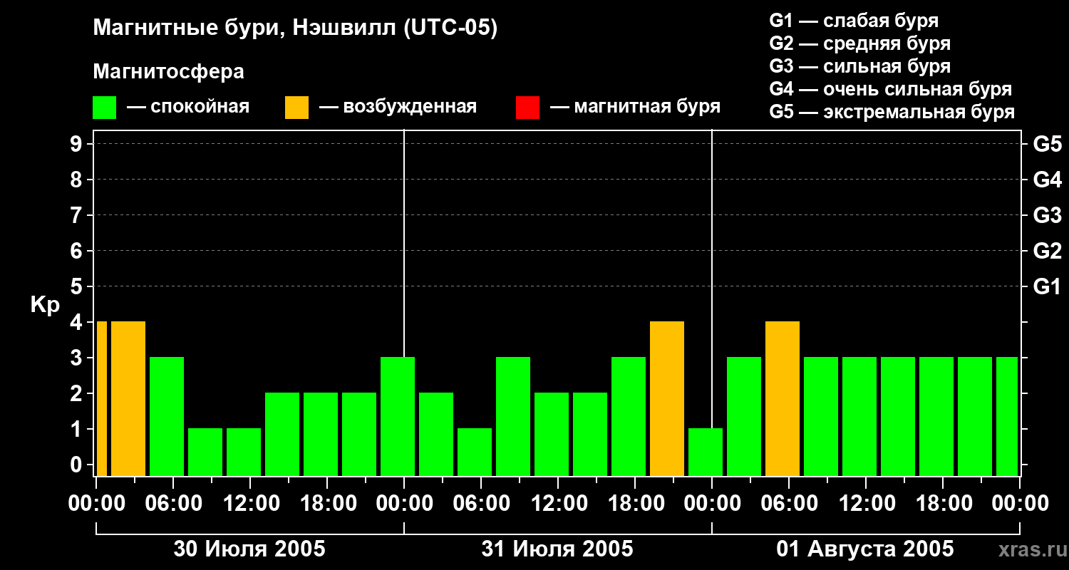 Изменения геомагнитного индекса Kp с 30 июля по 1 августа 2005 года для средних широт