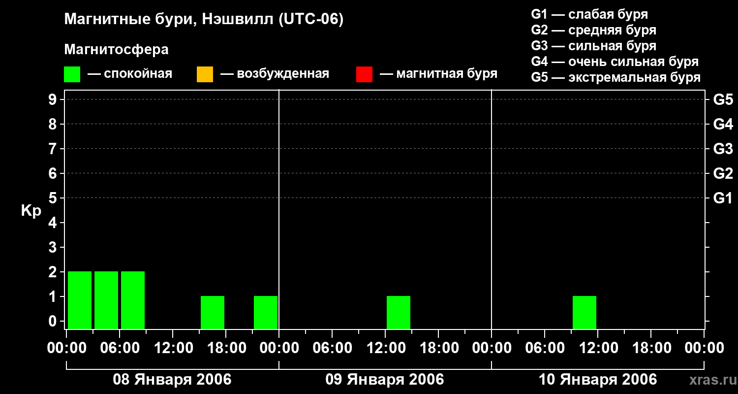 Изменения геомагнитного индекса Kp с 8 по 10 января 2006 года для средних широт