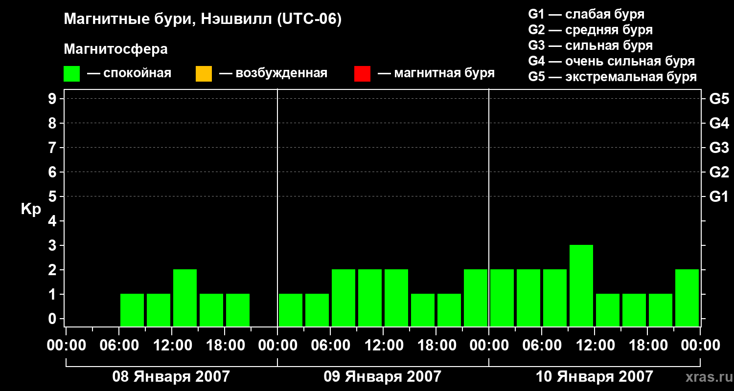 Изменения геомагнитного индекса Kp с 8 по 10 января 2007 года для средних широт