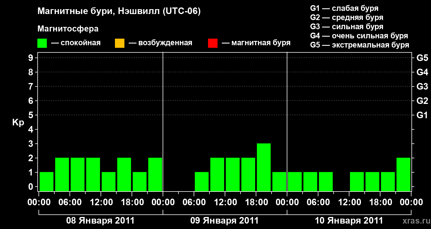 Изменения геомагнитного индекса Kp с 8 по 10 января 2011 года для средних широт