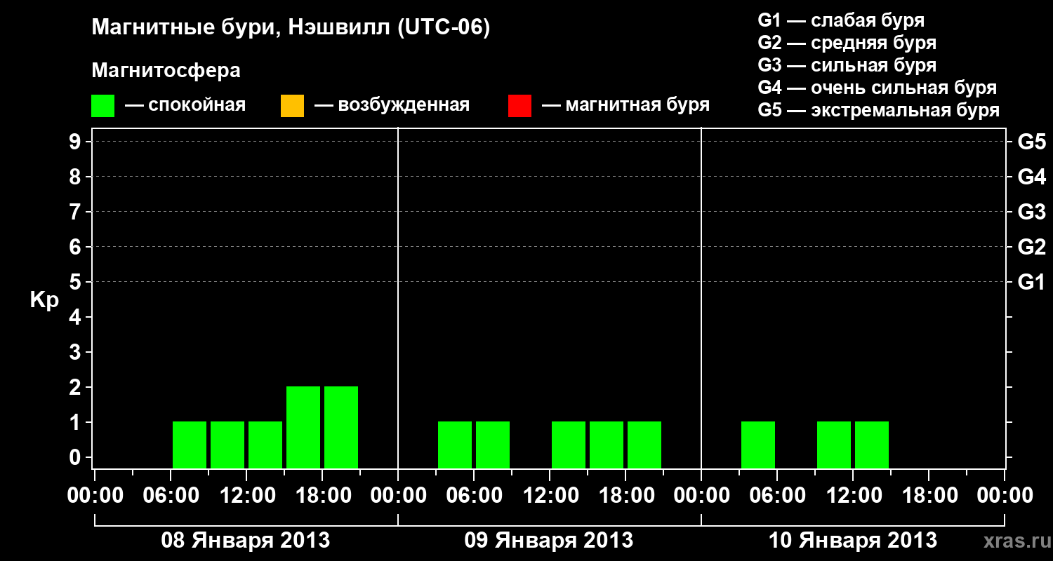 Изменения геомагнитного индекса Kp с 8 по 10 января 2013 года для средних широт