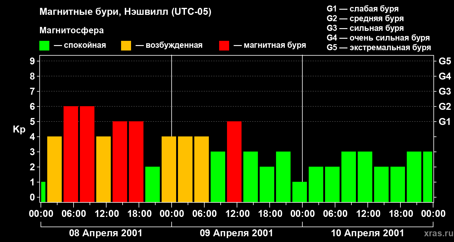 Изменения геомагнитного индекса Kp с 8 по 10 апреля 2001 года для средних широт