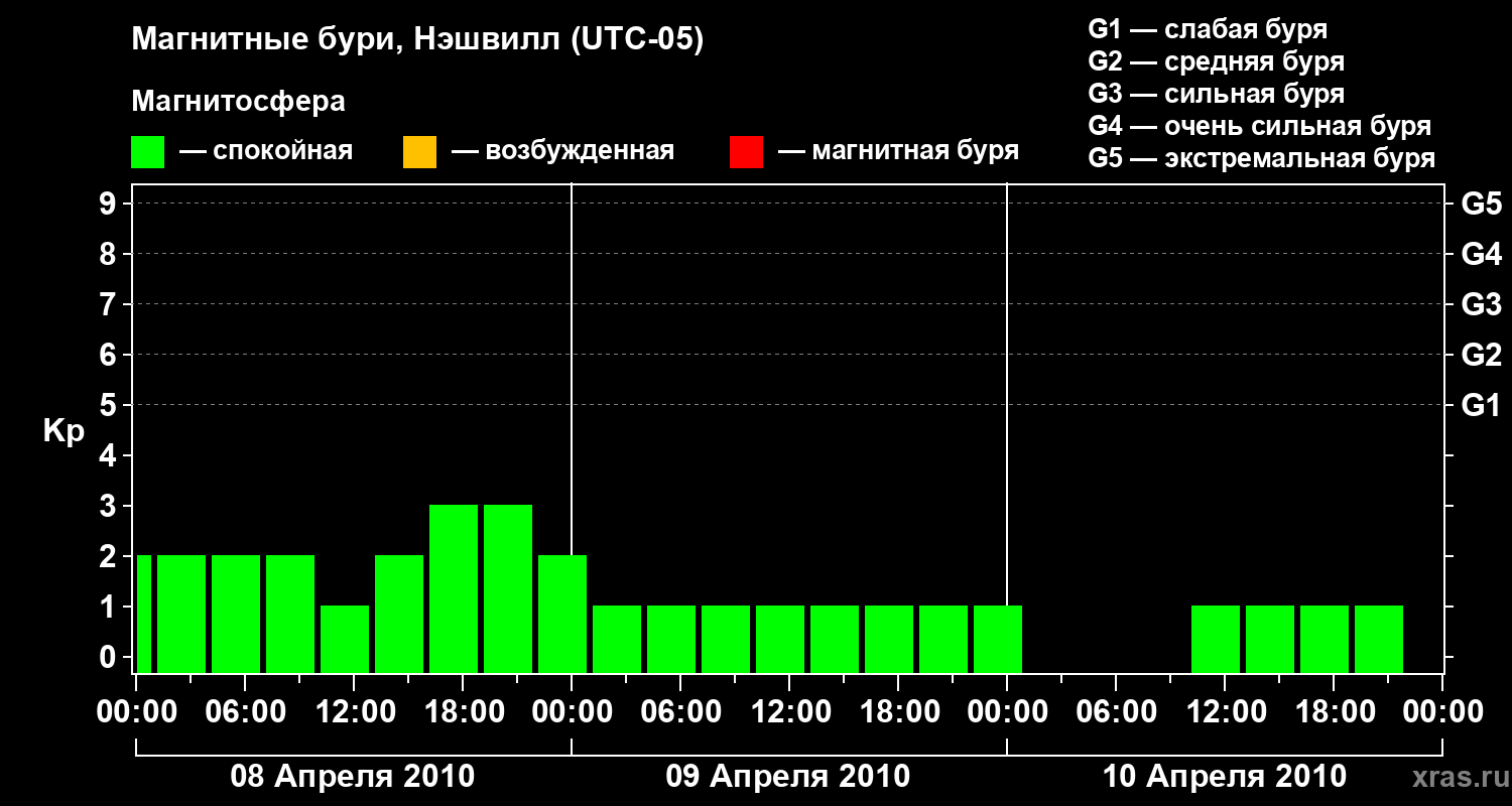 Изменения геомагнитного индекса Kp с 8 по 10 апреля 2010 года для средних широт