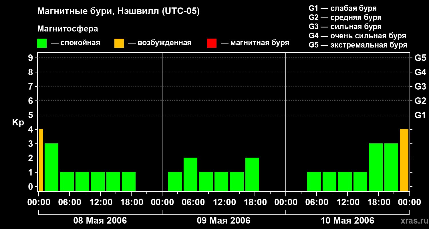 Изменения геомагнитного индекса Kp с 8 по 10 мая 2006 года для средних широт
