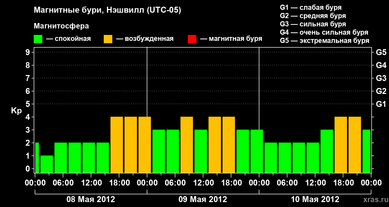 Изменения геомагнитного индекса Kp с 8 по 10 мая 2012 года для средних широт