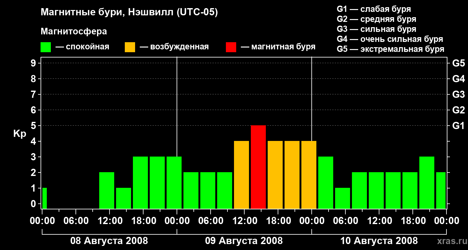 Изменения геомагнитного индекса Kp с 8 по 10 августа 2008 года для средних широт