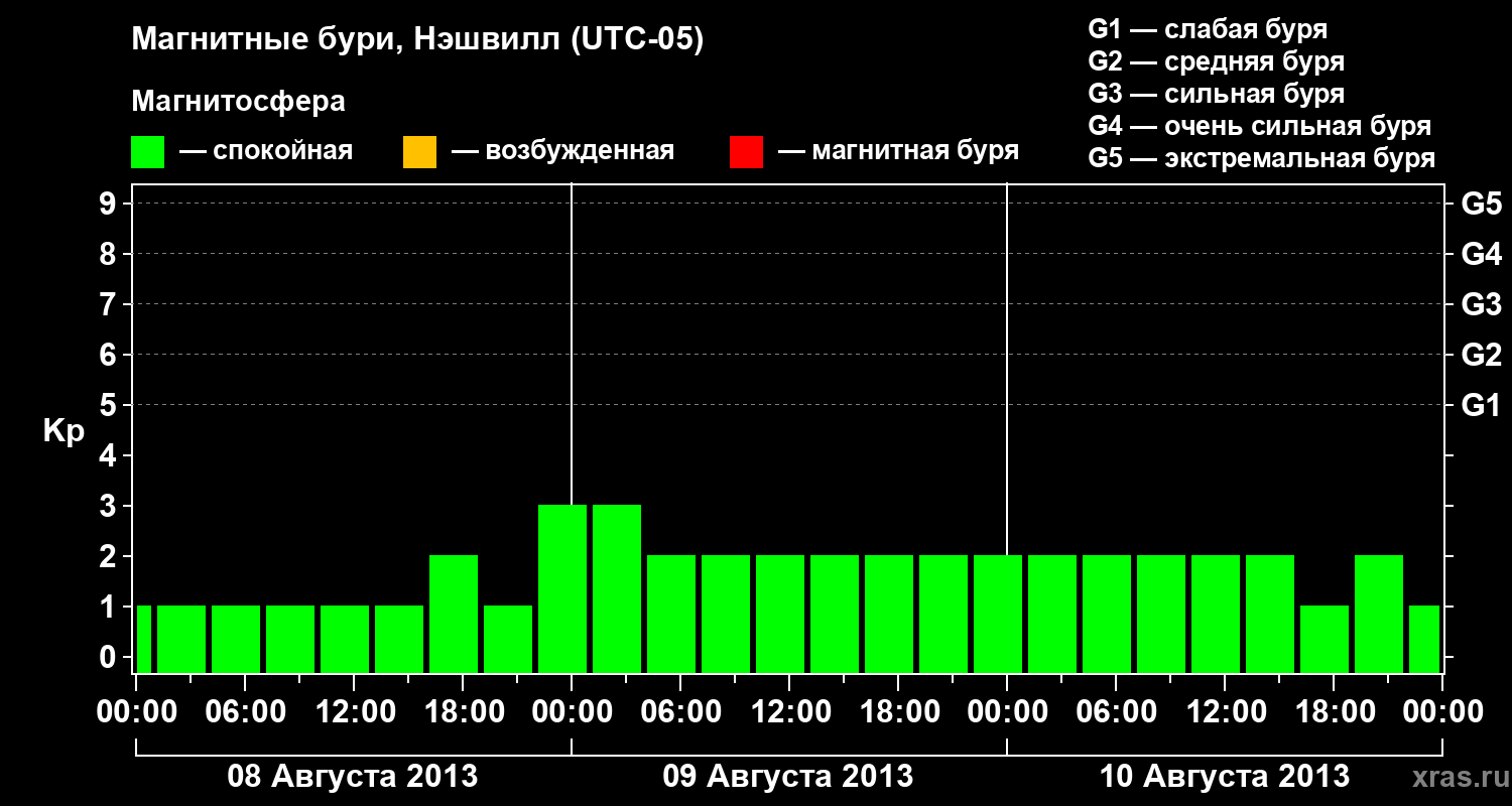 Изменения геомагнитного индекса Kp с 8 по 10 августа 2013 года для средних широт