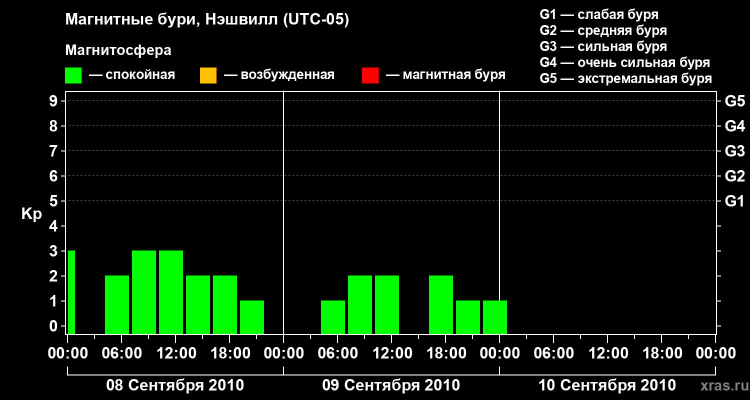 Изменения геомагнитного индекса Kp с 8 по 10 сентября 2010 года для средних широт