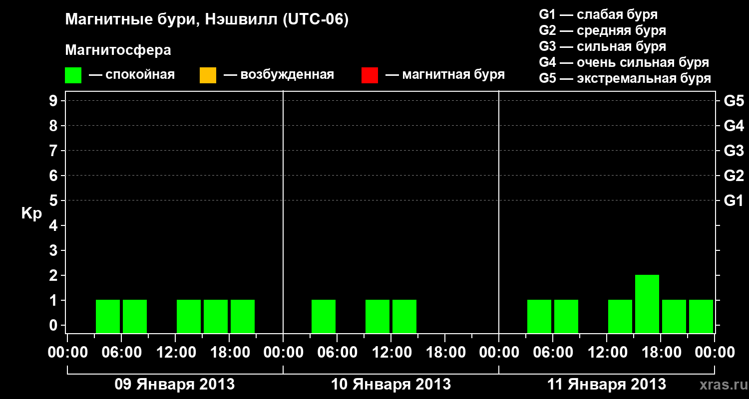 Изменения геомагнитного индекса Kp с 9 по 11 января 2013 года для средних широт